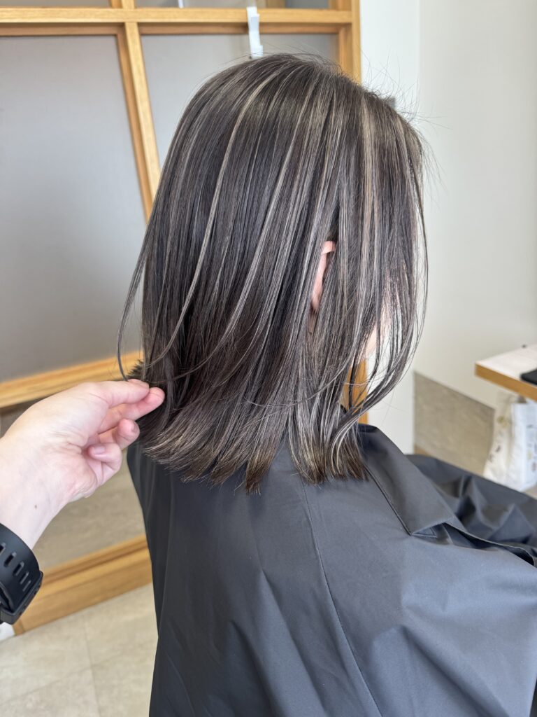 根本近くからブリーチを塗るため、白髪は目立ちにくくなります。